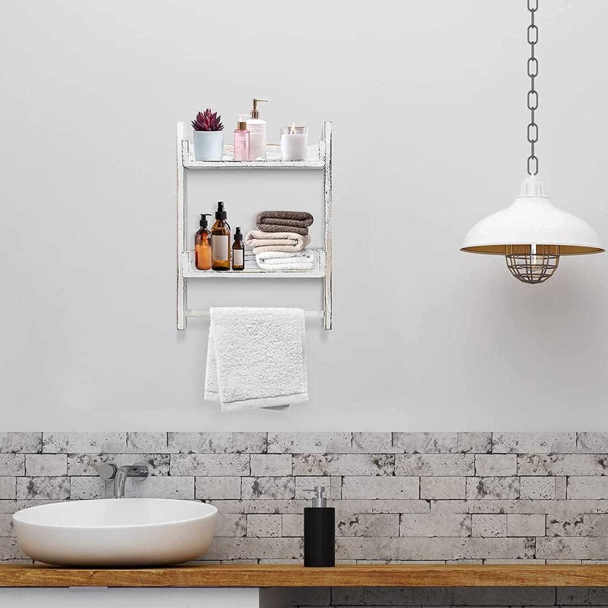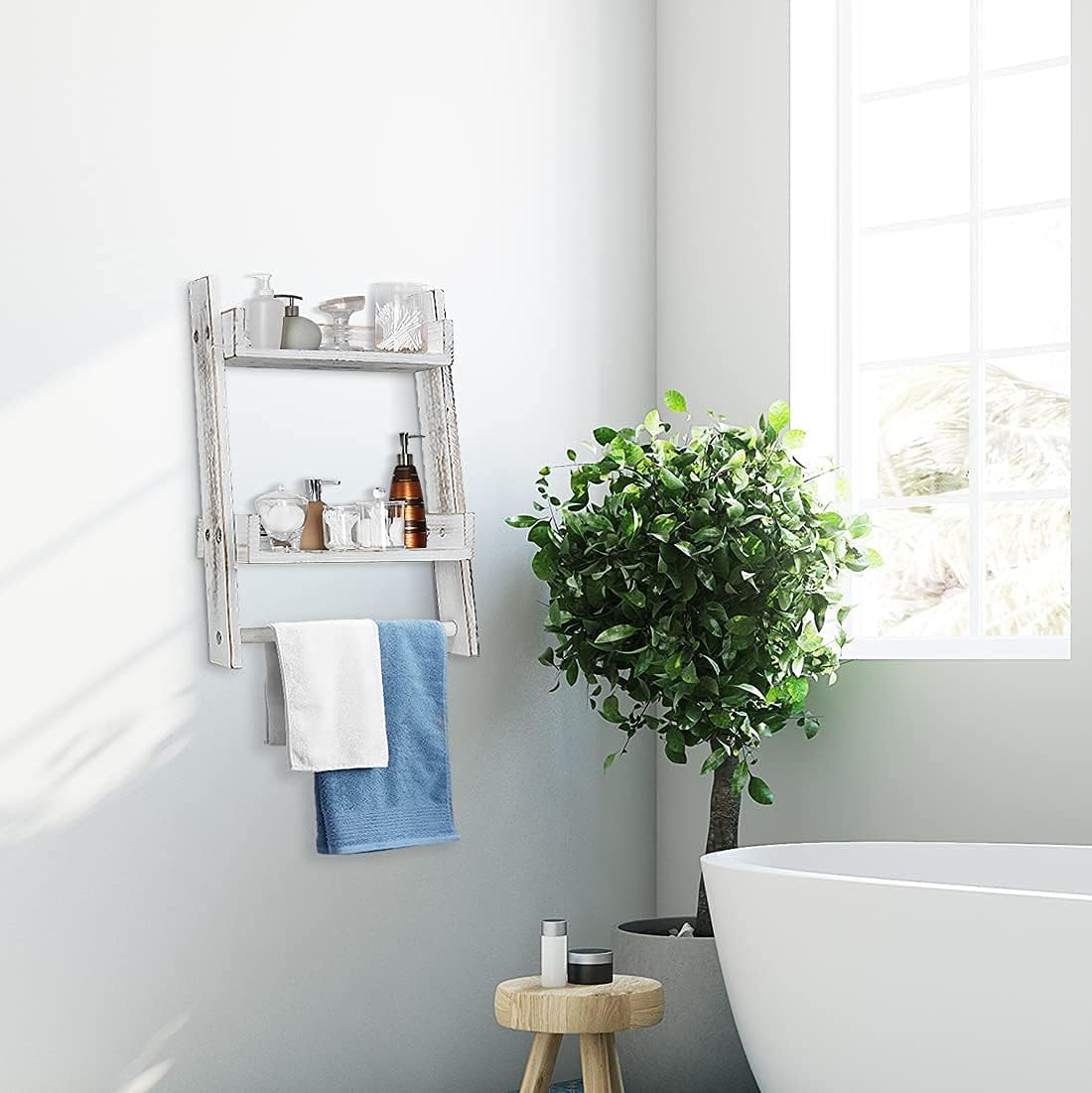 2-Tier Ladder Towel Rack with Bar, Towel Holder for Bathroom, Wall-Mounted Towel Storage Over Toilet, Bathroom Shelf for Towels and Toiletries, Wood Hanging Shelf for Bathroom…