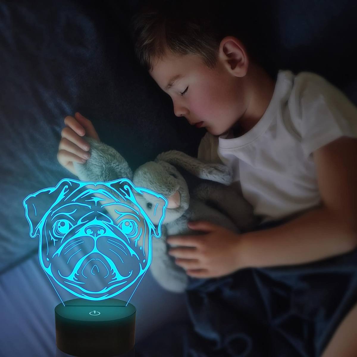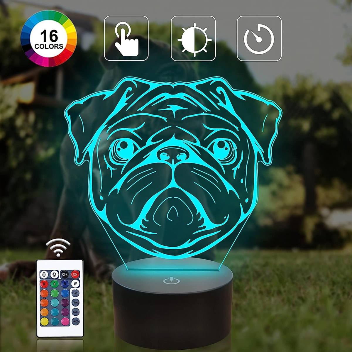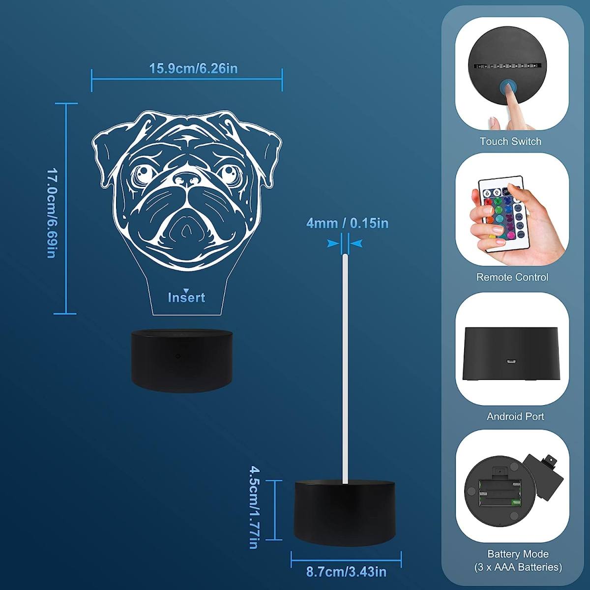 Pug 3D Lamp with Remote & Touch Control, Cute Dog Illusion Hologram Bedside Night Light 16 Color Change, Bedroom Decor Creative Christmas Birthday Gift for Kid Child Toddler